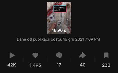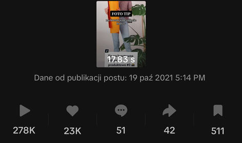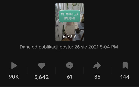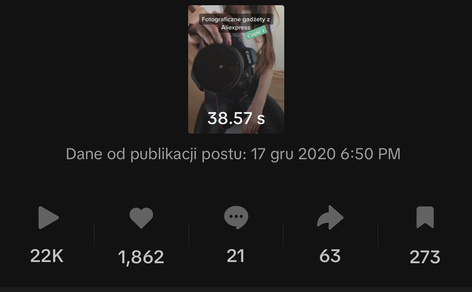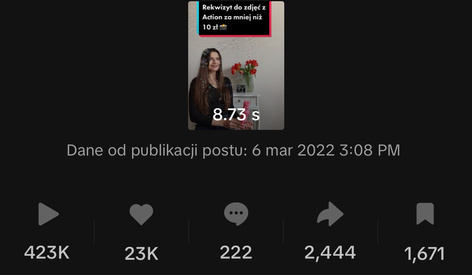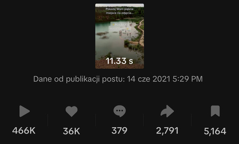 Statystyki niektórych moich filmów z TikToka, które mają charakter UGC (ruch organiczny).